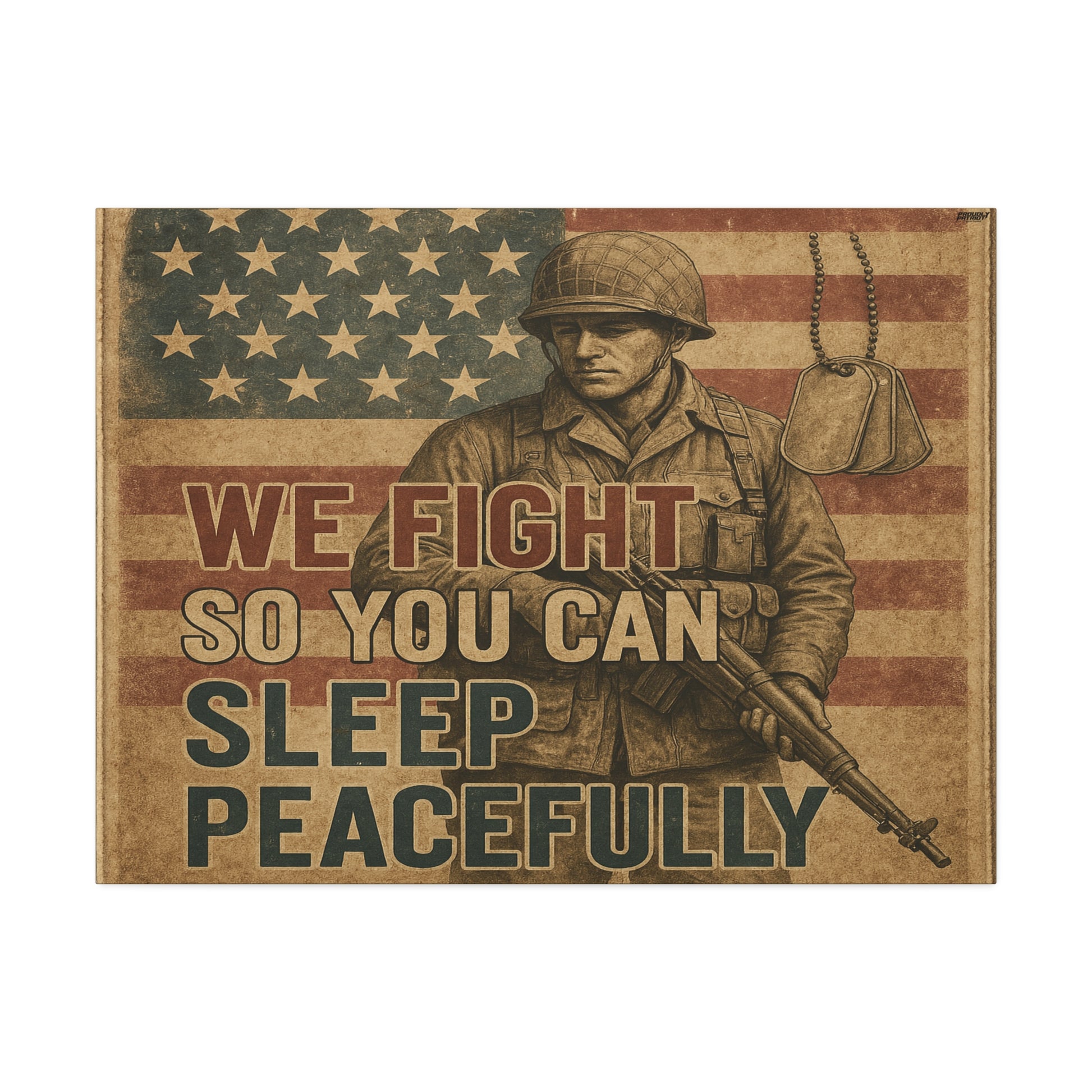 Honor the bravery and sacrifice of our military heroes with this Patriotic Soldier Tribute. Featuring a vintage-style illustration of a soldier in uniform against a weathered American flag backdrop, this blanket is a powerful symbol of courage and freedom. The bold message, "WE FIGHT SO YOU CAN SLEEP PEACEFULLY," is a heartfelt reminder of the dedication of our armed forces. Accented with dog tags and muted patriotic tones, this makes a meaningful gift for veterans, active-duty service members, or anyone who cherishes American values.